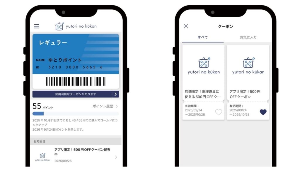 これまでポイントを共通でご利用いただくには、ゆとりの空間のLINE会員証の発行が必要でしたが、アプリのみで完結するようになりました(※2)。また、会員証下部「お知らせ」には、獲得済みのクーポンなどが表示されます。クーポンの使い忘れがなくなり、よりお得にお買いものをお楽しみいただけます。